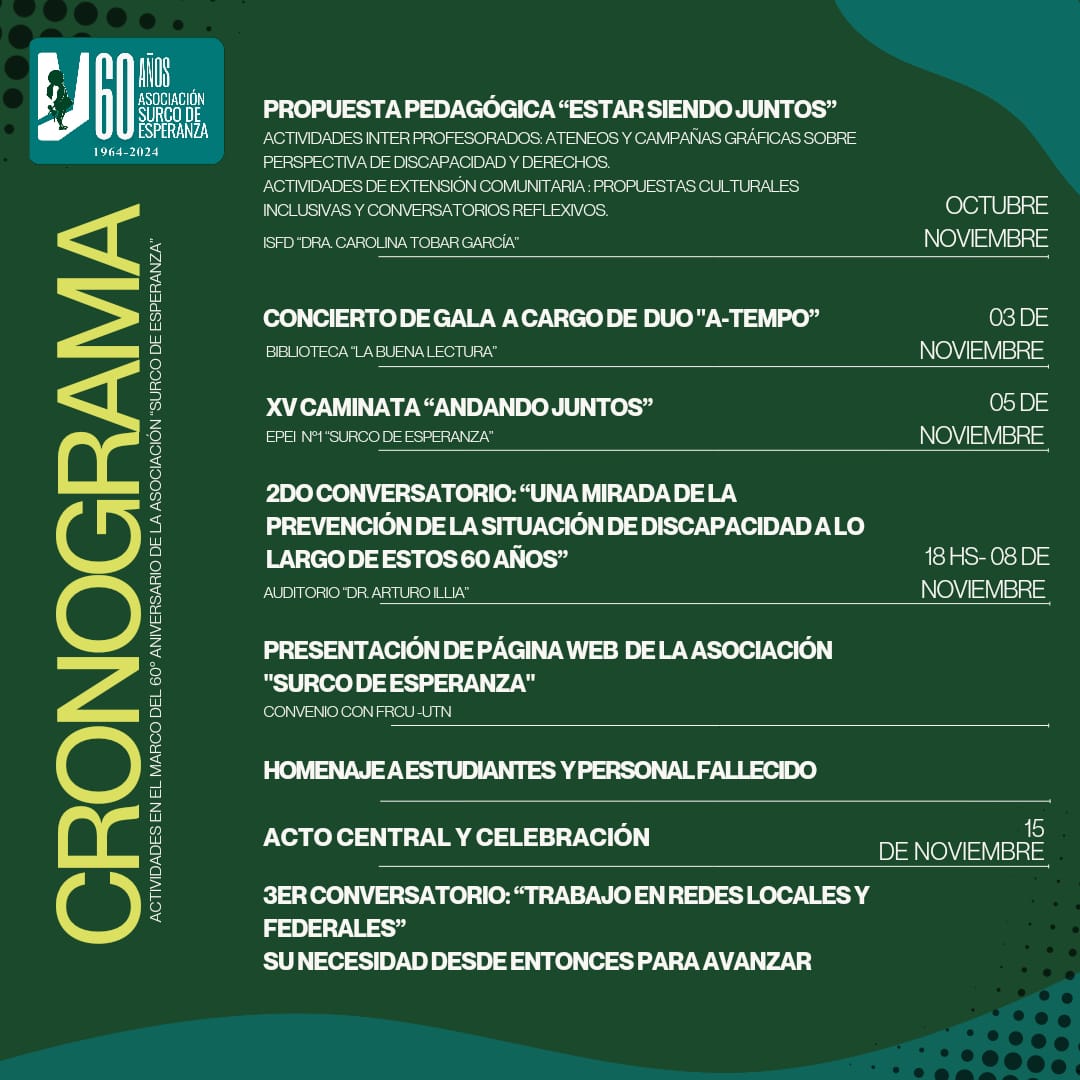 Tenemos el agrado de compartir el calendario de actividades para los próximos dos meses. Durante este período, organizaremos eventos y actividades comunitarias para fomentar la inclusión y el desarrollo integral. ¡Te invitamos a participar y ser parte de esta experiencia inclusiva!